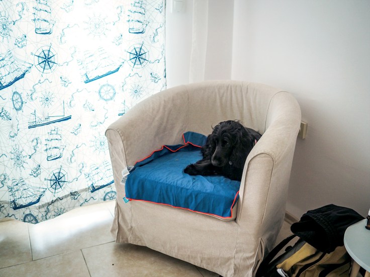 Ние си намерихме квартира в „Апартамент Котвата Панорама„. Стаята беше супер, с голяма тераса с гледка към морето и на метри от северната страна на крайбрежната алея, идеално. Единствено предполагам, че в силен сезон ще е шумно. Имахме едно кресло на което Мила обичаше да си ляга от време на време, и за целта си носих от вкъщи кърпа, с която да го покрия, за да не го изцапа тя. Преди тръгване изчистих леглото и креслото с една гумена четка, създадена точно за тази цел, и закупена от LIDL за няколко лева. Много добра покупка! Мисля, че е важно да не караме бизнесите, които приемат кучета да съжаляват, като видят мебелите си в кучешки косми след нас.